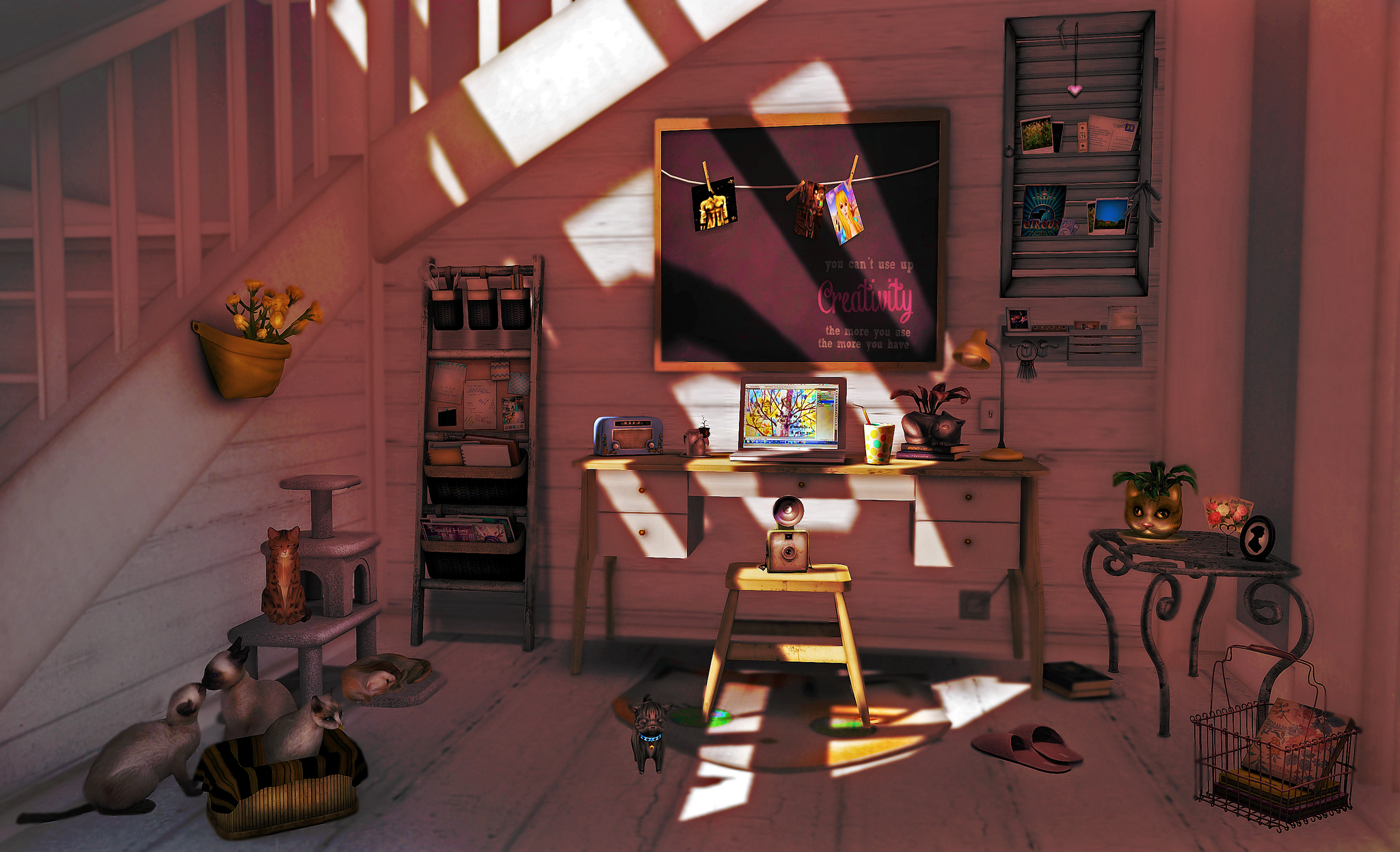 Although I do make some mesh furniture, my main focus is on creating low LI, high quality, original cottages. I concentrate on making bijoux homes as there are so many brilliant, furniture designers out there, most shoppers are totally spoilt for choice. The trend though for those who love styling their homes is definitely to shop around to pull together a collection of beautifully made pieces, from many different designers to create that unique signature look. Carmilla’s focus has been to fashion rooms which are warm, lived in, vintage and stylish. You can find all of the credits by following these links to her site!